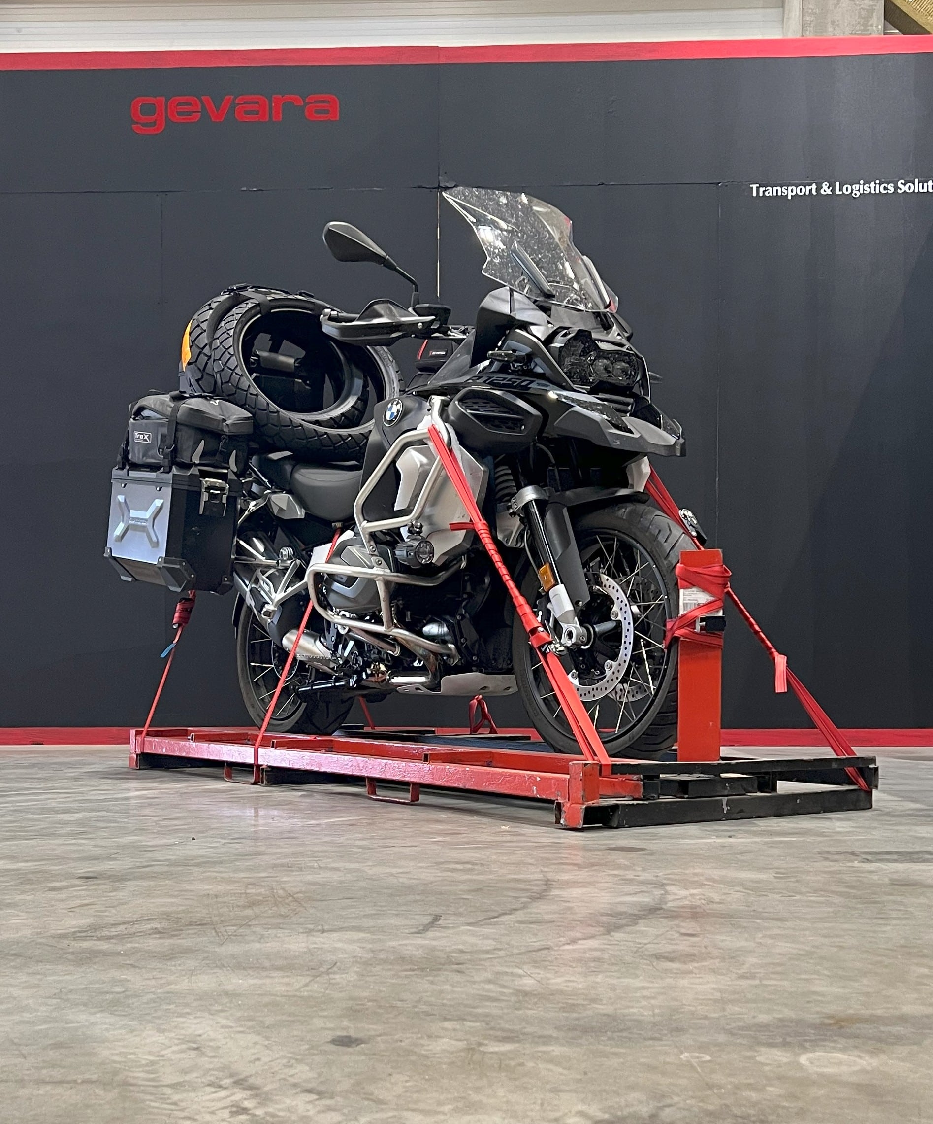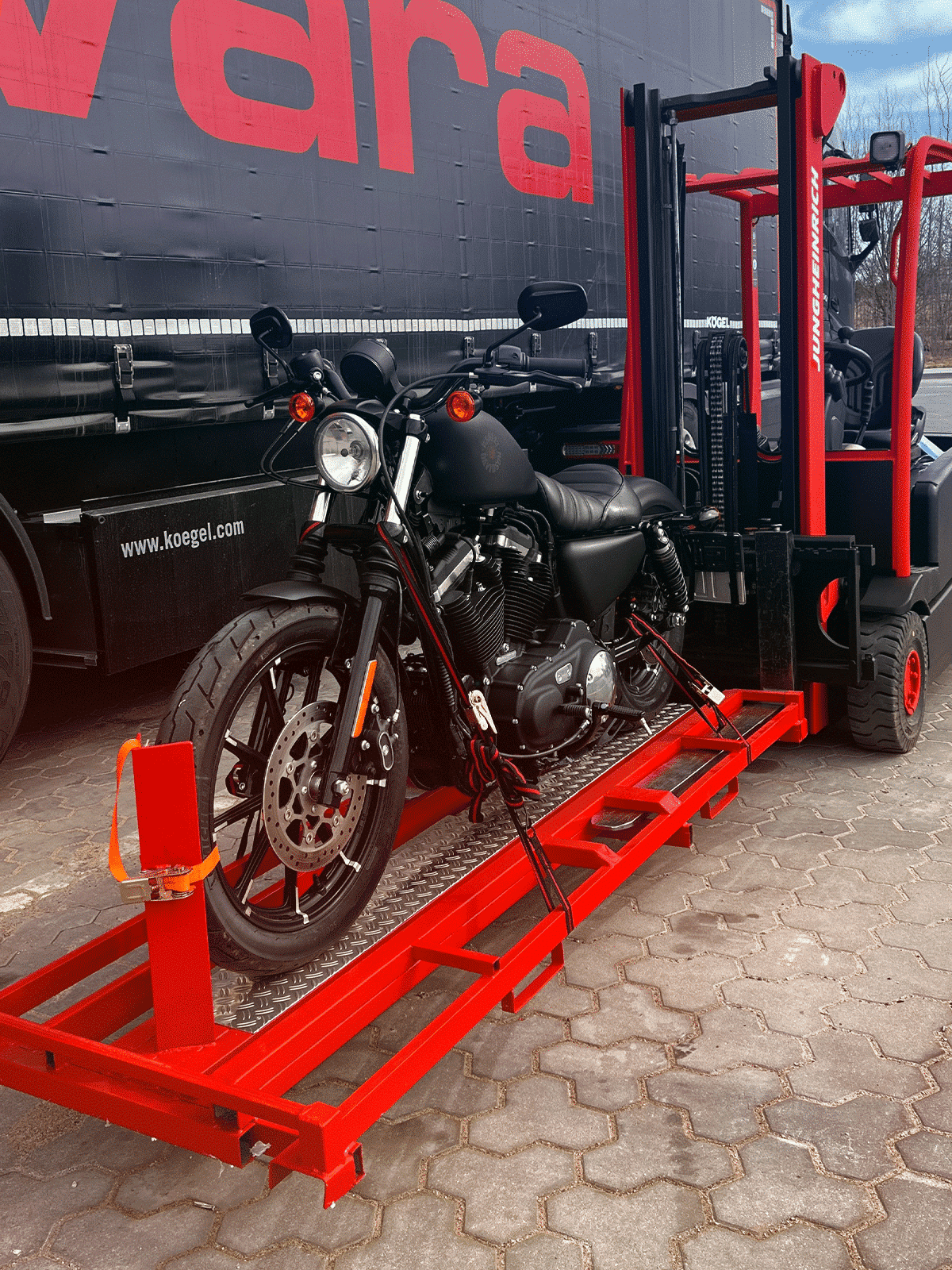 ✅ Motociklas užstumiamas ant mūsų unikalios platformos.